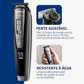 O Aparador de Pelos Mondial PraticGroom é perfeito para quem gosta de variar o visual e estar sempre impecável, de forma prática e em casa. Seu pente ajustável com 19 níveis de comprimento permite aparar todas as áreas do corpo com facilidade, enquanto os 5 pentes de corte com alturas de 3 mm, 6 mm, 9 mm, 12 mm e 15 mm, oferecem opções ainda mais precisas para barba, cabelo e pelos. As lâminas em aço inox ajustáveis são auto afiáveis e de alta durabilidade, adaptando-se a diferentes estilos e necessidades. Resistente à água, o aparador de pelos da Mondial proporciona mais liberdade de uso e torna a limpeza muito mais prática. Seja para um acabamento bem definido ou um look mais natural, o PraticGroom BG-09 entrega eficiência, controle e muita praticidade.