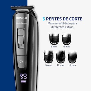 Pentes de Corte: O aparador acompanha 5 pentes removíveis com alturas de 3 mm, 6 mm, 9 mm, 12 mm e 15 mm, proporcionando opções para diferentes estilos.