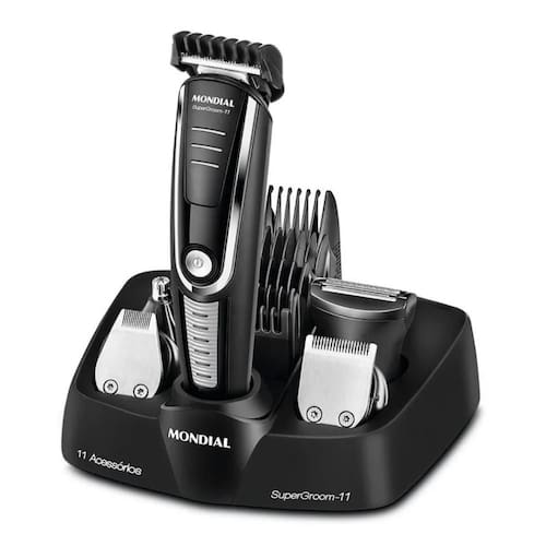 Mantenha o visual impecável com o Aparador de Pelos SuperGroom BG-05 da Mondial. Um aparelho completo com 11 funções para aparar cabelo, barba, bigode e pelos do corpo. Acompanha 5 cabeças de corte, 6 pentes ajustáveis (3 a 15 mm) e micro barbeador, ideal para acabamento preciso. Suas lâminas em aço inox proporcionam corte rente e suave, com alta durabilidade. O sistema sem fio oferece até 90 minutos de autonomia e a base organizadora mantém tudo no lugar, funcionando também como carregador.