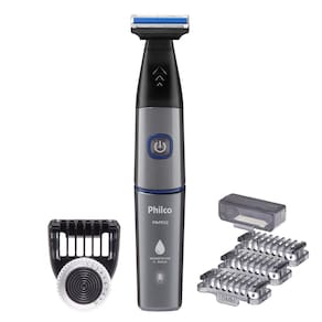 Aparador de Pelos Philco PAP02 possui 7 acessórios, lâminas em aço inox, e é resistente à água, permitindo uso em pele seca, úmida ou molhada. Com