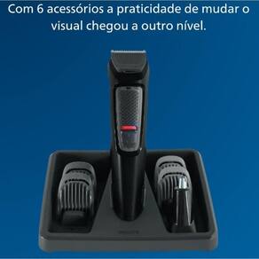Aparador De Pelos Philips 6x1 Preto Recarregavel Esse aparador foi desenvolvido para quem gosta de experimentar um visual diferente a qualquer dia da semana, suas seis ferramentas de qualidade permitem que você crie com facilidade exatamente o estilo de barba que você deseja. Obtenha um acabamento perfeito com suas lâminas auto afiáveis que não precisam de óleo de manutenção. Produto ideal para quem gosta de organização, pois acompanha um suporte de organização que garante que os acessórios estejam sempre prontos para o uso, e falando de acessórios o aparador contém 2 pentes para barba por fazer (1,2 mm) e 2pentes para barba (3,5 mm) e um aparador de pelos de nariz e orelha e os acessórios são laváveis.Desempenho de corteLâminas autoafiadoras e que não irritam a pele para um acabamento perfeito: As lâminas de aço tocam suavemente uma na outra afiando se enquanto funcionam. Com isso, as lâminas permanecem afiadas como no primeiro uso, mesmo após três anos de uso.VersatilidadeApare e modele sua barba e cabelo com 8 ferramentas. Apare as bordas da sua barba e o seu cabelo para completar o seu visual: Use o aparador sem o pente para aparar para obter linhas bem definidas ao redor da barba, pescoço e cabelo. O aparador de pelos do nariz remove gentilmente pelos indesejados do nariz e das orelhas.Ficha Técnica:6 pentes para aparar sua barba e cabelo;Fácil de usarTempo de funcionamento: até 60 minutos de uso sem fio por cargaAcessórios laváveis, para facilitar a limpeza: Basta desconectar e lavar as lâminas e os pentes em água corrente para limpá-los.Suporte de armazenamento para organizar o aparador e as ferramentasMarca PhilipsCor Preto e CinzaTipo da bateria Ni-MHAutonomia 60 minutosCarregamento Carga completa em 16 horasVoltagem automática 100-240V BivoltDimensões e PesoProduto AxLxP 3 x 15,5 x 3,20 cmPeso Liquido 0,628 KgAcessóriosAparadorAparador de pêlos do nariz e orelhas2 pente para barba2 pentes para barba por fazerEscova de limpezaSuporte de armazenamentoConteúdo da Embalagem1 Aparelho 6 Acessórios1 Suporte de armazenamentoManual de Instruções Ean: 8710103825593
