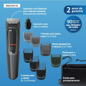 Informações do Produto - Marca: Philips - Ref. Modelo MG3747/15 - Lâminas autoafiadoras: Sim - Manutenção: Escova de limpeza - Bolsa: Bolsa para arrumação - Tipo da bateria: Ni-MH - Tempo de funcionamento: 70 minutos - Carregamento: Carga completa em 16 horas - Voltagem automática: 100-240 V - Limpeza: Acessórios laváveis - Sem necessidade de manutenção: Não é necessário lubrificar - Aparador em Metal: Utilize o aparador em metal sem pente para obter linhas precisas e bem desenhadas à volta da barba, pescoço e linha do cabelo ou para aparar os pelos corporais a um comprimento mínimo. - 9 acessórios para rosto, cabelo e corpo: Este aparador tudo-em-um é prático para aparar e estilizar os pelos faciais, cortar o cabelo e remover os pelos corporais. - 7 pentes resistêntes a impactos: 2 pentes curtos (1, 2 mm), 1 pente ajustável para barba (3-7 mm), 3 pentes para cabelo (9, 12, 16 mm) e 1 pente para pêlos corporais (3 mm).