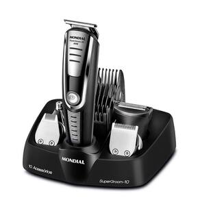 O Aparador de Pelos Super Groom 10 Mondial possui a funcionalidade de 10 produtos em 1! Conta com 5 aparadores para cabelo, rosto e corpo, 4 pentes de corte com guias de 3 mm, 6 mm, 9 mm e 12 mm, além de pente ajustável para a remoção dos pelos no comprimento que preferir. Suas lâminas em aço inox oferecem alto desempenho para um corte rente, preciso e suave.