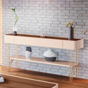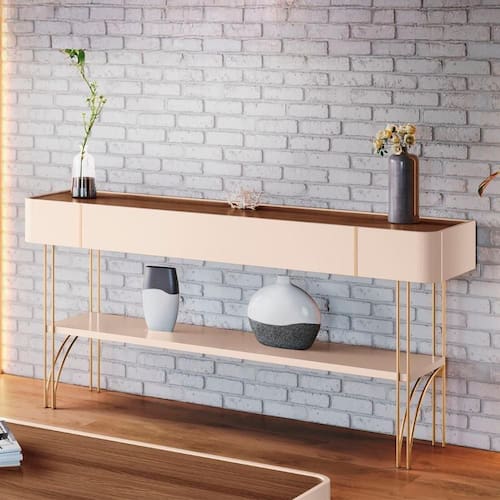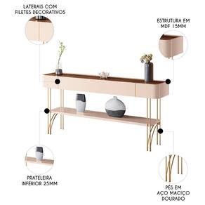 O Aparador de Sala pode ser tanto na Sala De Estar quanto no hall de entrada, na cozinha ou no quarto. Ele serve para apoiar objetos decorativos, livros, plantas, luminárias e até mesmo servir de bar. Um modelo que se destaca pela beleza e qualidade é o Aparador Com Prateleira, ideal para compor a decoração ou ser utilizado como divisor de ambientes. Esse aparador tem um design contemporâneo, que combina as formas orgânicas dos cantos arredondados com os filetes decorativos nas laterais, que dão um toque de charme e sofisticação. Fabricado em MDF de 15mm, materiais resistentes e duráveis, que garantem a estabilidade e a do móvel. Os pés são de aço maciço, com acabamento em tom dourado, que conferem elegância e requinte ao aparador. A prateleira inferior de 25mm é perfeita para guardar revistas, cestos ou outros itens que você quiser organizar ou expor. Uma peça que valoriza o seu ambiente, trazendo funcionalidade e estilo para a sua casa.