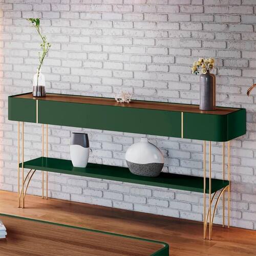 O Aparador de Sala pode ser tanto na Sala De Estar quanto no hall de entrada, na cozinha ou no quarto. Ele serve para apoiar objetos decorativos, livros, plantas, luminárias e até mesmo servir de bar. Um modelo que se destaca pela beleza e qualidade é o Aparador Com Prateleira, ideal para compor a decoração ou ser utilizado como divisor de ambientes. Esse aparador tem um design contemporâneo, que combina as formas orgânicas dos cantos arredondados com os filetes decorativos nas laterais, que dão um toque de charme e sofisticação. Fabricado em MDF de 15mm, materiais resistentes e duráveis, que garantem a estabilidade e a do móvel. Os pés são de aço maciço, com acabamento em tom dourado, que conferem elegância e requinte ao aparador. A prateleira inferior de 25mm é perfeita para guardar revistas, cestos ou outros itens que você quiser organizar ou expor. Uma peça que valoriza o seu ambiente, trazendo funcionalidade e estilo para a sua casa.