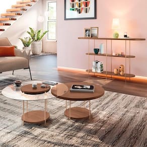 O tampo do Aparador Para Sala em 25mm possui um detalhe usinado com vidro embutido de 6mm, e as prateleiras oferecem amplo espaço para objetos decorativos e livros. As Mesas de Centro é uma perfeita combinação de design contemporâneo e materiais de qualidade. Com tampo em MDF de 25mm em uma das mesas e bordas de vidro 6mm na outra, elas se complementam harmoniosamente. Os pés em aço maciço 3/8 com acabamento dourado do conjunto adicionam um toque sofisticado, garantindo elegância e estabilidade. O aparador e as mesas de centro, com seu design sofisticado e materiais de alta qualidade, são a escolha ideal para transformar e valorizar qualquer espaço, proporcionando sofisticação e funcionalidade.