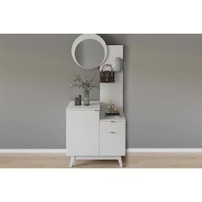 Tipo de Porta: - Portas de Bater Tipo de Corrediça: - Corrediças Metálicas Quantidade de Portas: - 2 Portas de Abrir Tipo de Espelho: - Espelho Externo Quantidade de Espelhos: - 1 Tipo de Puxador: - Puxador Metálico Tipo de Gaveta: - Gaveta Externa Quantidade de Gavetas: - 1 Gaveta Tipo de Dobradiças: - Dobradiças Metálicas Material das Prateleiras: - Prateleira Madeirada Quantidade de Prateleiras: - 1 Prateleira Tipo dos Pés: - MDP Quantidade de Pés: - Móvel possui 4 pés