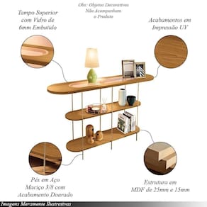 Material da Estrutura: MDF de 25mm e 15mmTampo Superior: MDF de 25mm com Vidro Embutido de 6mmPeso Suportado: 25 kg distribuídosQuantidade de Prateleiras: 2Acabamento: Impressão UV FoscaPés: Aço maciço 3/8 com Acabamento DouradoAcompanha Manual de Montagem: SimConteúdo da Embalagem: 1 Aparador