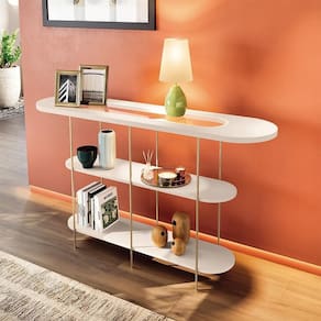 Material da Estrutura: MDF de 25mm e 15mmTampo Superior: MDF de 25mm com Vidro Embutido de 6mmPeso Suportado: 25 kg distribuídosQuantidade de Prateleiras: 2Acabamento: Impressão UV FoscaPés: Aço maciço 3/8 com Acabamento DouradoAcompanha Manual de Montagem: SimConteúdo da Embalagem: 1 Aparador