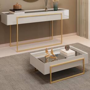 Aparador E Mesa De Centro Kika, peças que combinam elegância e funcionalidade para compor diferentes ambientes com estilo. Estrutura em MDP/MDF com acabamento em pintura UV texturizada. Possuem bordas laterais chanfradas, espelhos (3 mm) integrado aos tampos e pés em metal (pintura epóxi). Este produto será entregue em 4 volumes.