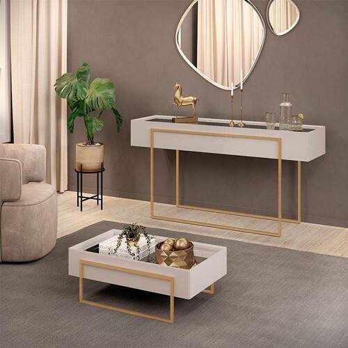 Está montando sua sala? Apresentamos para você este belo conjunto composto pelo aparador e a mesa de centro da linha Suri. O design moderno é marcado por laterais chanfradas e pelo tampo com espelho aplicado agregando requinte. Os pés em metal na cor dourado dá um toque de elegância e sofisticação. Fabricados pela DJ Móveis, são desenvolvidos em MDP/ MDF provenientes de madeira de reflorestamento, garantindo resistência, durabilidade e respeito ao meio ambiente. Com acabamento refinado e materiais de alta qualidade, é perfeito para quem busca unir funcionalidade, beleza e luxo em um só ambiente. Confira e aproveite!