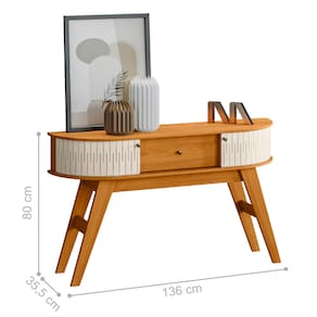 O Aparador é feito em MDP 15/25mm. Possui 1 prateleira para acomodar objetos decorativos, 2 portas curvas em MDF e 1 gaveta com corrediça telescópica.