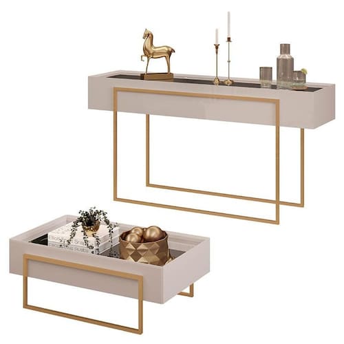 Está montando sua sala? Apresentamos para você este belo conjunto composto pelo aparador e a mesa de centro da linha Suri. O design moderno é marcado por laterais chanfradas e pelo tampo com espelho aplicado agregando requinte. Os pés em metal na cor dourado dá um toque de elegância e sofisticação. Fabricados pela DJ Móveis, são desenvolvidos em MDP/ MDF provenientes de madeira de reflorestamento, garantindo resistência, durabilidade e respeito ao meio ambiente. Com acabamento refinado e materiais de alta qualidade, é perfeito para quem busca unir funcionalidade, beleza e luxo em um só ambiente. Confira e aproveite!