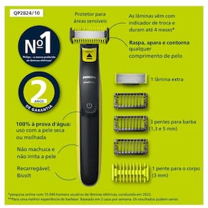 Feito para cortar o pelo, não a pele. Philips OneBlade é a maneira revolucionária de fazer a barba e remover os pelos corporais, com tecnologia exclusiva que garante raspar, aparar e contornar qualquer tamanho de pelo, sem cortes ou irritações. Inclui 1 lâmina extra, protetor para áreas sensíveis, 3 pentes para aparo da barba e 1 pente para aparo do corpo. Uso seco ou molhado. 2 anos de garantia.