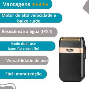 Descrição do anúncio: Barbeador elétrico kemei 2024 bivolt recarregável Agora você pode ficar sempre com a barba perfeita com o barbeador portátil de lâmina dupla kemei. Ideal para pessoas que têm alergia a lâminas tradicionais como gillette ou navalhas, o kemei 2024 oferece um método de barbear menos agressivo e sem irritação. Este shaver é recarregável via usb, levando 8 horas para uma carga completa e oferecendo 60 minutos de uso contínuo. Com suas duas lâminas, ele proporciona um corte mais rápido e eficiente. Importante: para melhores resultados, utilize uma máquina zero antes de usar o shaver em pelos curtos.