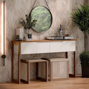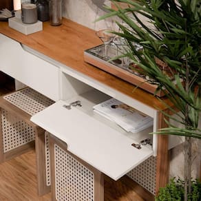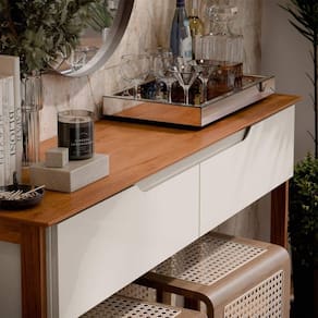 Aparador Eros Off White Com Freijo O Aparador Eros é a peça perfeita para transformar sua sala de estar ou jantar com sofisticação e praticidade. Com um design moderno e elegante, ele apresenta um tampo chanfrado invertido que se destaca, conferindo um visual único ao ambiente. As duas portas sem puxadores são emolduradas por uma régua frontal em duas cores, proporcionando um toque exclusivo e refinado. Além disso, o aparador conta com pés em madeira maciça, garantindo estabilidade e resistência, enquanto oferece um espaço funcional para exibir e organizar objetos ões:Altura: 81 cmLargura: 138 cmProfundidade: 34 cmObservações:- Estrutura elaborada em MDF e MDP, assegurando durabilidade e resistência.- Pés em madeira maciça, garantindo estabilidade e um toque natural ao design.- Portas sem puxadores com detalhe em régua em duas cores para um visual sofisticado.- Tampo chanfrado invertido, trazendo um design moderno e elegante.- Ideal para organizar e decorar diversos ambientes, agregando charme e funcionalidade.