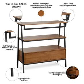 Características do Produto -Gaveta espaçosa com corrediça telescópica -Pés e estrutura em metalon no estilo industrial -Acabamento semi gloss com impressão ultravioleta -Tampo e prateleiras em chapa de 15 mm com fitas PVC -Cantos retos em estilo geométrico -Gaveta com batente dupla face, trazendo visual modern -Sapata plástica anti risco para proteger o piso -Ideal para hall de entrada, sala, escritório ou corredor
