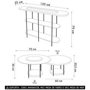 Peso Suportado Distribuído: 25 Kg Aparador / 4 Kg Mesa MDF / 5 Kg Mesa Vidro.