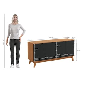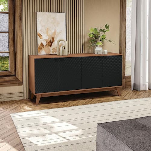 O corpo, com pintura na cor canela e acabamento touch, possui a textura dos veios da madeira, já as portas, em MDF e acabamento BP e 18mm, são na cor preto fosco e detalhe em alto-relevo geométrico e amortecimento, completando a beleza do produto. Os puxadores metálicos facilitam o manuseio e garantem estilo à peça. Uma combinação clássica e elegante para todos os espaços e tipo de decoração.
