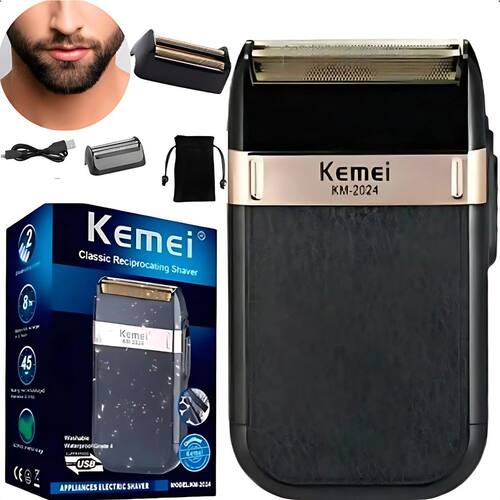 Descrição do anúncio: Barbeador elétrico kemei 2024 bivolt recarregável Agora você pode ficar sempre com a barba perfeita com o barbeador portátil de lâmina dupla kemei. Ideal para pessoas que têm alergia a lâminas tradicionais como gillette ou navalhas, o kemei 2024 oferece um método de barbear menos agressivo e sem irritação. Este shaver é recarregável via usb, levando 8 horas para uma carga completa e oferecendo 60 minutos de uso contínuo. Com suas duas lâminas, ele proporciona um corte mais rápido e eficiente. Importante: para melhores resultados, utilize uma máquina zero antes de usar o shaver em pelos curtos.