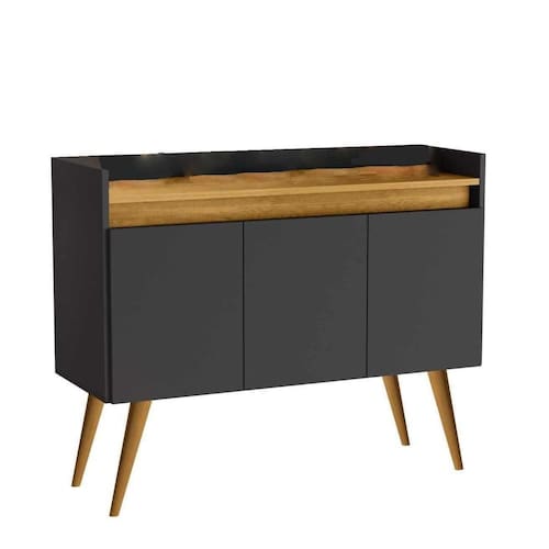 Aparador Luxo 3 Portas cor Preto / madeirado, estilo retrô com pés palito. DIMENSÕES DO PRODUTO MONTADO Altura: 0,81 cm Largura: 0,90 cm Profundidade: 0,36 cm CARACTERISTICAS: Pés palito em madeira maciça Portas com dobradiças metalica Material: 100% MDP MONTAGEM: Este produto acompanha kit de montagem + manual de instrução detalhando passo a passo de como montar. A montagem do produto deverá ser feita por um profissional, para que não ocorram danos no produto.
