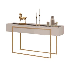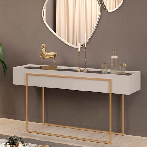 Características Material MDF Impressão ultravioleta -UV- alto brilho e texturizada Laterais chanfradas Pés em metal com pintura epóxi dourada Espelho de 3mm aplicado no tampo. Peso máximo suportado: 15Kg