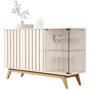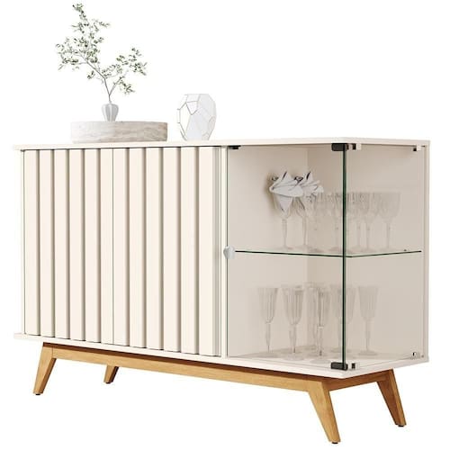 Material da estrutura: estrutura ripadas com MDP e MDF de 24mm; tampo, base e prateleira em MDP de 15 mm; portal, lateral e prateleira de vidro 4mm e com pés em madeira maciça;