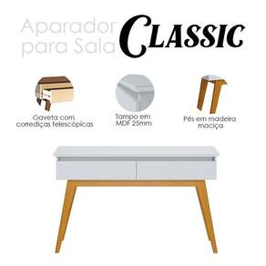 Apresentamos para você este belo aparador da linha Classic, uma peça elegante e funcional que combina sofisticação e praticidade. Com duas gavetas espaçosas, são perfeitas para guardar seus acessórios mantendo tudo organizado. As corrediças telescópicas garantem um deslizamento suave e silencioso. Seus pés em madeira maciça oferece mais estabilidade e dá um toque de elegância. Fabricado pela Imcal, é produzido em MDP/ MDF com materiais de alta qualidade garantindo mais durabilidade por muitos anos. O design clássico e acabamento impecável será uma experiência perfeita entre praticidade e qualidade. Confira e garanta o seu!