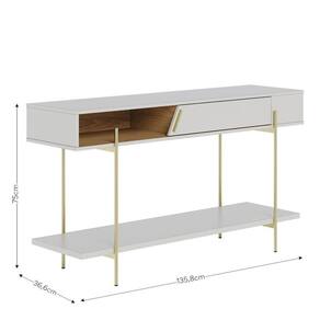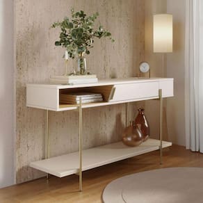 funcionalidade. Com prateleira inferior para organizar e expor objetos, o conjunto equilibra estética e praticidade, trazendo ao espaço a mesma