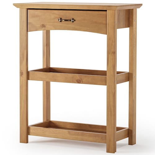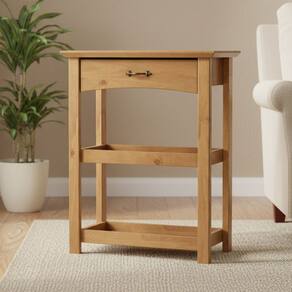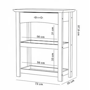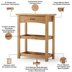 Com seu design único com duas prateleiras no estilo bandeja, ele é perfeito para servir como apoio em sua área gourmet, bar ou mesmo na sala de jantar. Use para organizar talheres e temperos, exibir drinks com amigos ou como um ponto de apoio prático durante aquela festa. Além disso, a gaveta oferece armazenamento discreto para itens menores, mantendo tudo ao alcance das mãos e longe da bagunça. Para completar, esse aparador é fabricado em madeira maciça com acabamento verniz carvalho fosco e um charmoso puxador em metal medieval, garantindo durabilidade e um toque de sofisticação rústica ao seu ambiente.