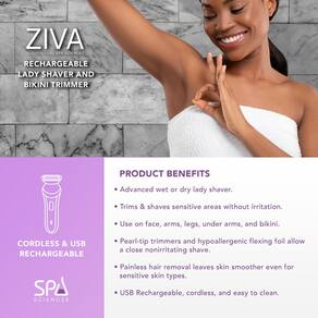 Ferramenta de barbear – O barbeador feminino ZIVA pode ser utilizado molhado ou seco, dando a você uma pele lisa mesmo no banho ou chuveiro. Cabeçote de corte – Projetado para alcançar uma pele sem pelos em áreas sensíveis. A cabeça de corte é construída para proporcionar um barbear mais rente e proteger a pele sensível da irritação. Conforto – ZIVA é projetado com aparadores seguros de ponta de pérola para permitir um barbear rente e não irritante. Design ergonômico – Projetado para caber perfeitamente em suas mãos com uma aderência antiderrapante para um barbear seguro no chuveiro ou banheira. Recarregável por USB – Desfrute de conveniência sem fio e nunca lute com as restrições de ser preso a uma tomada de parede. ZIVA é ideal para uso em movimento.