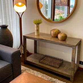 Esse aparador em madeira maciça é feito de madeira 100% renovável e possui acabamento rústico. Além de decorativo, ele ajuda na organização e disposição dos objetos que deseja deixar no hall, e também pode ser utilizado na sala de jantar, sala de estar ou até mesmo no quarto.