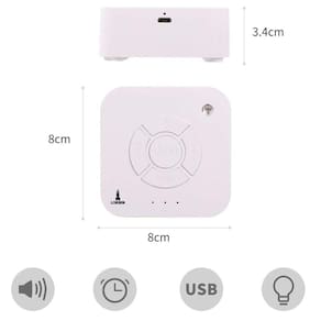 - 5 botões de controle: play/pausa, temporização, luz, música anterior (incluindo função de redução de som) e uma próxima música (incluindo função de som mais)