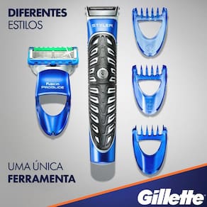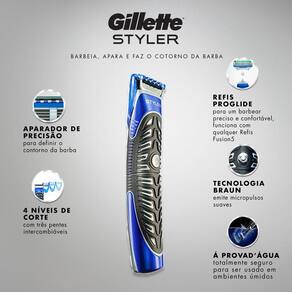 O Gillette STYLER multifuncional apara de maneira uniforme, proporciona um barbear rente e um acabamento com precisão. O Styler conta com tudo do que você precisa para qualquer estilo de barba. O Gillette STYLER multifuncional combina as lâminas do Fusion ProGlide com um aparador desenvolvido pela Braun, para aparar de maneira uniforme, com um barbear rente e um acabamento preciso. Essa ferramenta multifuncional é à prova dágua e pode ser usada com segurança no chuveiro, além de funcionar com todos os refis de lâminas do Gillette Fusion, para que você possa manter seu estilo de barbear predileto com uma única ferramenta. Tecnologia desenvolvida pela Braun com três pentes intercambiáveis Realmente multifuncional Aparador preciso Design A prova d'agua Apara de maneira uniforme e rente. Ean: 7702018330126