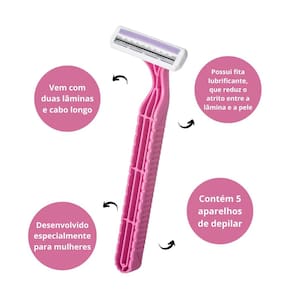 O Aparelho de Depilar Woman foi desenvolvido especialmente para mulheres, o aparelho possui fita lubrificante, que reduz o atrito entre a lâmina e a pele e evita irritações. Contém 5 aparelhos de depilar, vem com duas lâminas e cabo longo.