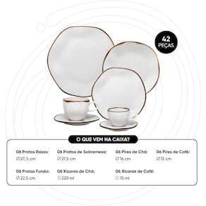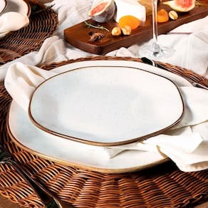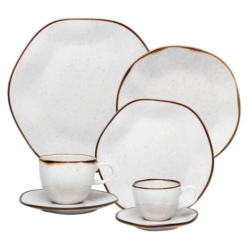 O aparelho de jantar Ryo Maresia é inspirado no conceito japonês wabi-sabi, que valoriza a beleza do imperfeito, do natural e do único, celebrando o processo artesanal e o acabamento singular de cada peça. A coleção traduz a essência das praias, o toque suave da areia e o frescor do mar, criando uma composição elegante e acolhedora para a mesa. As peças recebem aplicação manual de esmalte com pigmentação especial e filete reagente, garantindo variações sutis que tornam cada item exclusivo. Além de sofisticar as refeições do dia a dia, o conjunto oferece versatilidade com peças complementares que permitem compor mesas completas e harmoniosas. O aparelho é composto por 6 pratos rasos de 27,5 cm de diâmetro, 6 pratos fundos de 22,5 cm de diâmetro e 4,5 cm de altura, 6 pratos de sobremesa de 21,5 cm de diâmetro, 6 xícaras de chá de 220 ml com pires de 16 cm e 6 xícaras de café de 75 ml com pires de 12 cm, unindo estética, funcionalidade e autenticidade em cada detalhe.