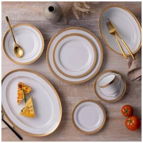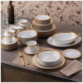 Descubra a beleza atemporal da nossa porcelana branca, fina e pura, uma verdadeira obra de arte que transforma qualquer mesa em um ambiente sofisticado. Cada peça é meticulosamente trabalhada, apresentando uma borda larga em dourado, em relevo, que não apenas embeleza, mas também adiciona um toque de luxo e requinte. Este serviço completo foi cuidadosamente projetado para atender até oito pessoas, tornando-se a escolha perfeita para jantares elegantes, celebrações especiais e momentos memoráveis em família e entre amigos.