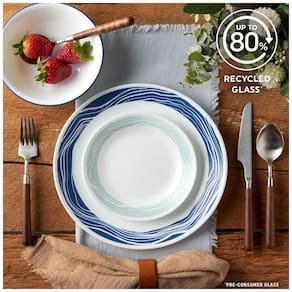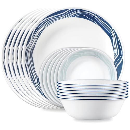 Aprimore sua experiência gastronômica com este versátil conjunto de jantar Corelle, trazendo estilo atemporal e clássico. Composto por 18 peças, incluindo seis pratos rasos de 25,7cm, seis pratos de sobremesa de 16,9cm e seis tigelas de sopa/cereal de 532ml. Inspirado em pedras marmoreadas e anéis de crescimento de árvores, apresenta tons de azul. Feito em vidro triplo Corelle, é resistente a quebras e rachaduras, leve e empilhável para economizar espaço. Pode ser utilizado em micro-ondas e forno, além de ser seguro para lava-louças. Este conjunto completo é ideal para servir 6 pessoas com estilo clássico e elegante.