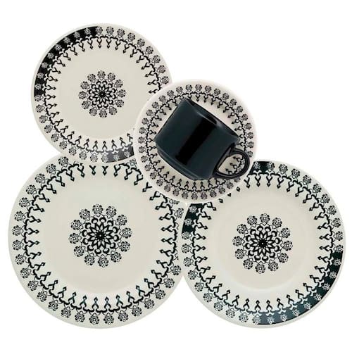 O conjunto de jantar Folk da Oxford possui peças com cor neutra e básica, se tornando um verdadeiro curinga na hora de montar a mesa. Ele é composto por 20 peças, sendo eles: 4 pratos rasos 24cm, 4 pratos fundos 21cm, 4 pratos sobremesa 19cm e 4 xícaras de chá 200ml com pires. A estampa dos pratos é elegante e jovial, perfeita para quem prefere um formato de pratos tradicional com uma decoração mais alegre. A xícara de chá preta cria uma linda composição com os pires. Além de lindo, esse aparelho de jantar tem tudo para fazer sucesso nas refeições do dia a dia. NA