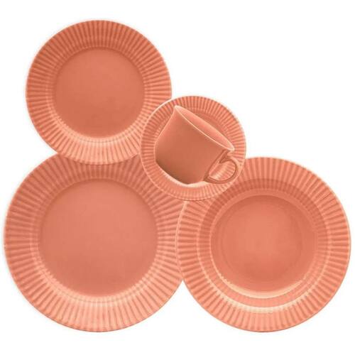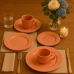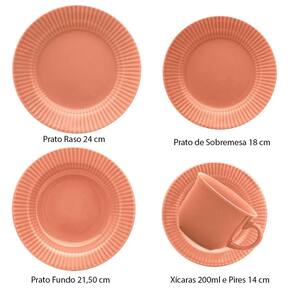 Aparelho de Jantar e Chá de Cerâmica Canelé Salmão 20 Peças - Biona 135817 Alguns objetos transcendem a função e se tornam parte da nossa história. O aparelho de jantar e chá em cerâmica da coleção Canelé Biona é um convite à beleza dos detalhes, inspirado no tradicional doce francês Canelé, famoso pelo seu formato canelado e alma acolhedora. Com peças cuidadosamente desenhadas em cerâmica de alta qualidade, a coleção traz como assinatura o relevo sutil nas bordas dos pratos - uma homenagem ao formato marcante da iguaria francesa. A tonalidade salmão envolve a mesa com sua suavidade e charme, trazendo luz, leveza e um toque de aconchego a qualquer ocasião. O aparelho de jantar e chá Canelé Salmão Biona transforma refeições simples em momentos de conexão. Ideal para quem valoriza a arte de receber e deseja compor uma mesa acolhedora, delicada e cheia de personalidade. Seja no café da manhã de domingo ou em um jantar especial, ele desperta sensações e memórias que aquecem o coração. Além de belo, é funcional: as peças são resistentes ao micro-ondas e à lava-louças, combinando estética refinada com praticidade para o dia a dia. Garanta já o seu Características do Produto: Marca: Biona Material: Cerâmica Tonalidade: Salmão Formato do Item: Redondo Uso: Resistente a micro-ondas e lava-louças Conteúdo da Embalagem: 4 pratos rasos 24cm, 4 pratos fundos 21,50cm, 4 pratos de sobremesa 18cm e 4 xícaras de chá 200ml com pires 14cm : 90 dias de legal para vícios ou defeitos de fabricação. Imagens meramente ilustrativas, não acompanham decorações. Não nós responsabilizamos, no ato da entrega, por subir escadas/elevadores ou pelo transporte de guincho em apartamentos. Eventuais despesas são de responsabilidade do comprador. Marca: Não Informado