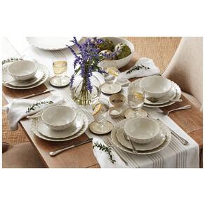 O conjunto de louças French Perle da Lenox é especial por seu design fresco e feminino, que evoca o charme atemporal do interior da França. Com babados delicados e um acabamento manchado de chá, este conjunto oferece um toque moderno a um visual country clássico. Seu padrão elegante combina perfeitamente com coleções como Classic, Groove e Bead, trazendo um charme distintivo à sua mesa, ideal para criar uma experiência gastronômica calorosa e sofisticada.