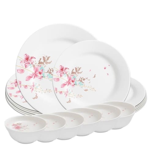Este aparelho de jantar é composto por pratos rasos, pratos de sobremesa e bowls, adequados para refeições completas e diversas ocasiões. Fabricado em vidro, o material oferece resistência e superfície lisa, facilitando a limpeza e valorizando a apresentação dos alimentos. A estampa floral com detalhes em tons de rosa, azul e toques dourados proporciona um toque delicado à mesa.