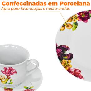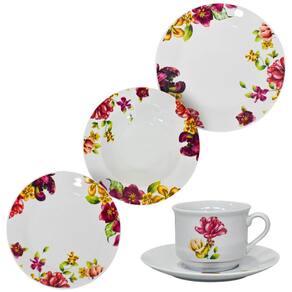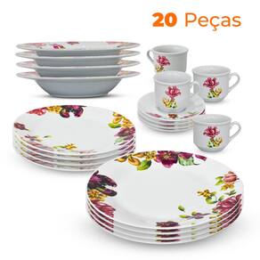 Composição 20 Peças: 4 Pratos de Sobremesa - 19,3cm de diâmetro 4 Pratos Fundos - 20,4cm de diâmetro 4 Pratos Rasos - 27cm de diâmetro 4 Xícaras de Chá - 8,7cm de diâmetro 4 Pires - 15,3cm de diâmetro