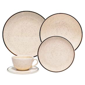 O jogo é composto por 40 peças redondas que são produzidas em cerâmica de altíssima qualidade na cor bege claro com bordas e detalhes marrons, que traz uma sensação de leveza a sua mesa.