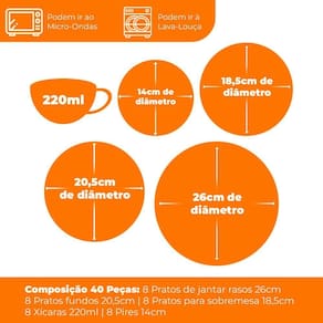 Acompanham 8 pratos rasos, 8 pratos fundos ideais para sopas e cremes, 8 pratos para sobremesa e 8 xícaras com pires.