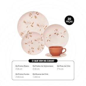 Produzido em cerâmica esmaltada estampada, o aparelho une beleza, resistência e praticidade. Seu delicado relevo proporciona conforto ao toque e cria uma experiência sensorial única durante as refeições.