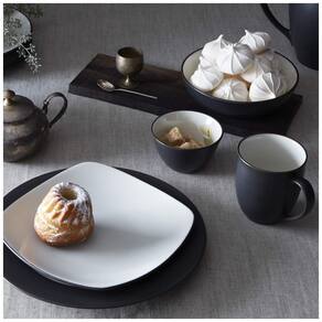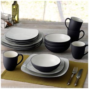 O Noritake Colorwave Graphite 16-Piece Set inclui serviço para 4 pessoas, com 4 pratos de jantar, 4 pratos de salada, 4 tigelas e 4 canecas na cor grafite fosco com interiores de creme brilhante.