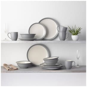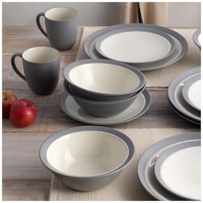 O conjunto Noritake Colorwave Slate de 16 peças serve 4 pessoas e inclui 4 pratos de jantar, 4 pratos de salada, 4 tigelas e 4 canecas, com acabamento cinza ardósia fosco por fora e esmalte creme brilhante por dentro.