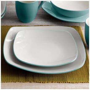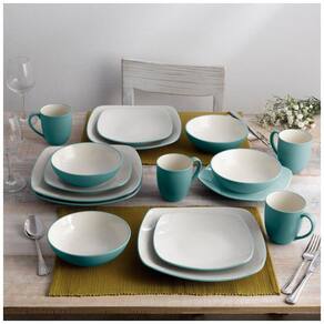 O conjunto de 16 peças inclui pratos de jantar, pratos de salada, tigelas e canecas em esmalte turquesa com interior creme, servindo 4 pessoas.