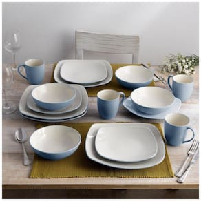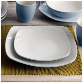O conjunto Colorwave Ice de 16 peças da Noritake serve 4 pessoas e inclui louça quadrada na cor azul gelo fosca, com interiores em creme brilhante. O conjunto contém 4 pratos de jantar, 4 pratos de salada, 4 tigelas e 4 canecas.